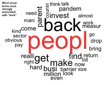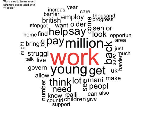 Whether analysing media coverage, focus group transcripts or testing messages, “people” is often a very high salience word we use when talking about politics (this is my own anecdotal observation). And the word cloud above shows that “work” was the term most frequently associated with “people” in the corpus.