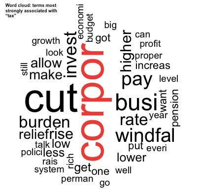 In the corpus “tax” is the fourth most salient word, the highest ranked policy word throughout. KWIC analysis revealed some other qualitative findings.