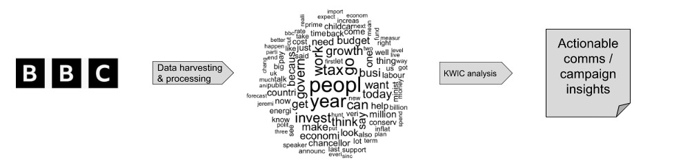 Within this corpus of BBC media coverage of the budget. “Tax”, “work”, “growth” etc were salient, whereas “wages”, “cost of living”, and public services like the NHS were low salience or missing altogether.